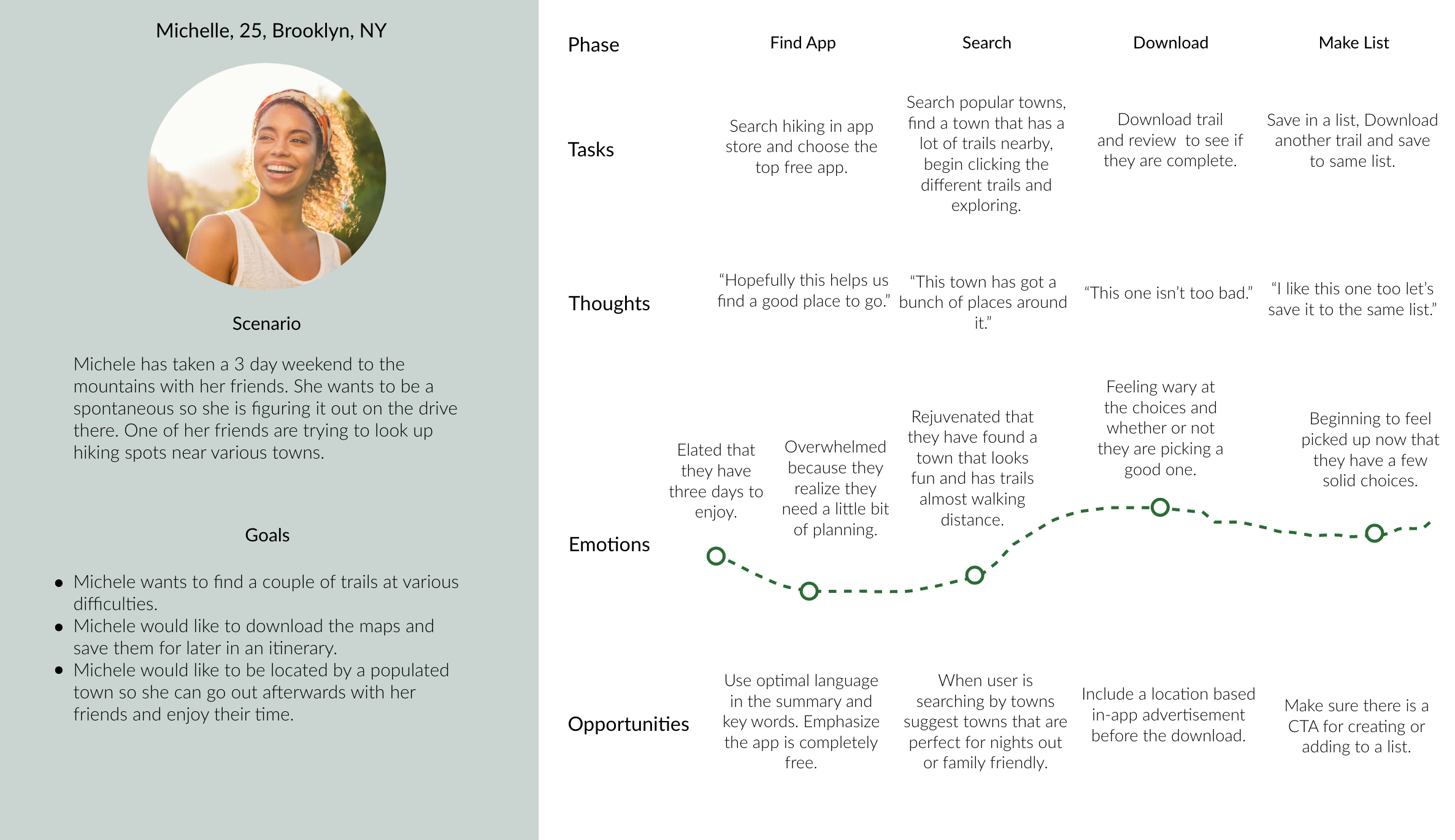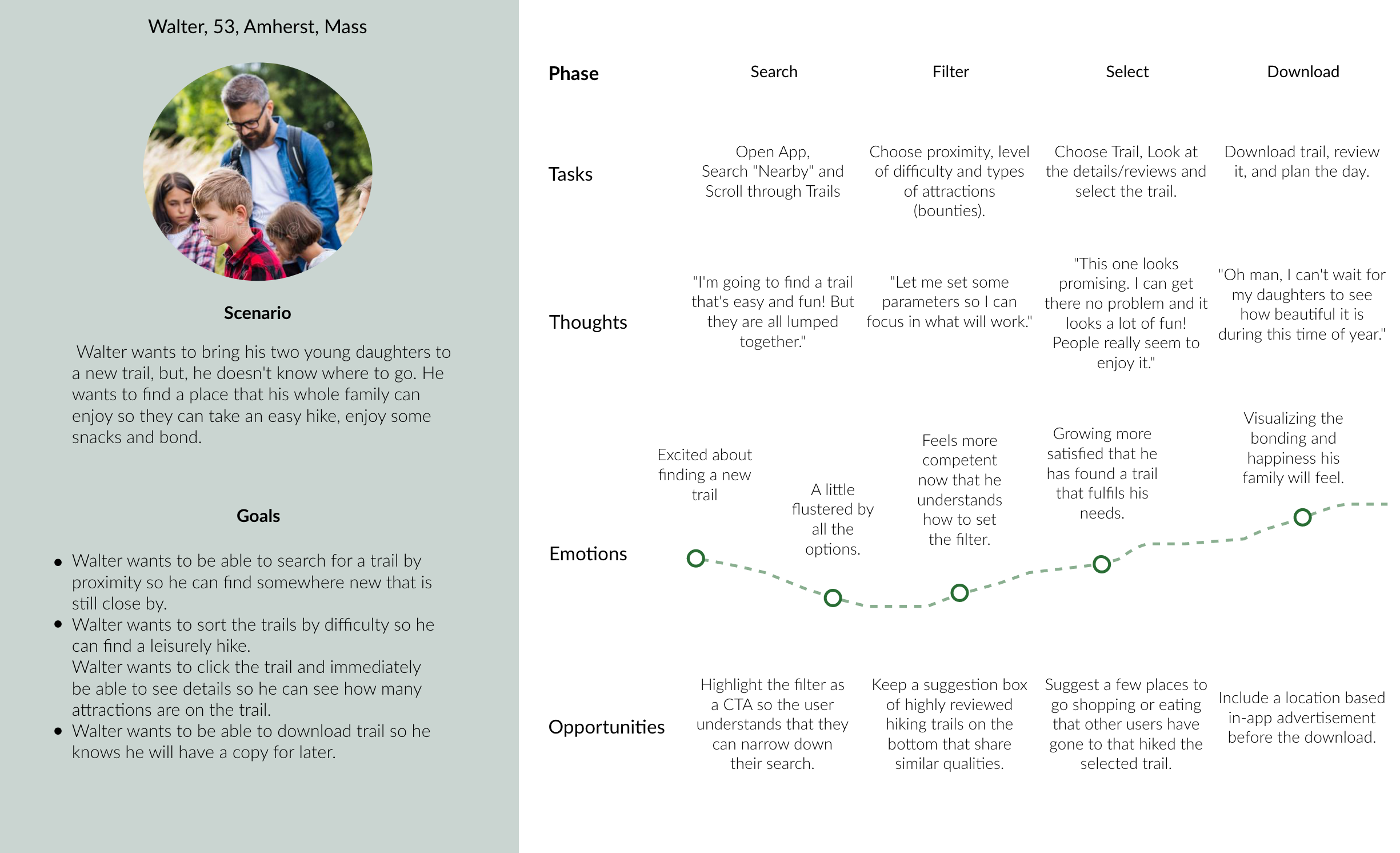 I started off by determining possible problems users might encounter while trying to find a trail to hike and narrowed it down to a simple problem statement: